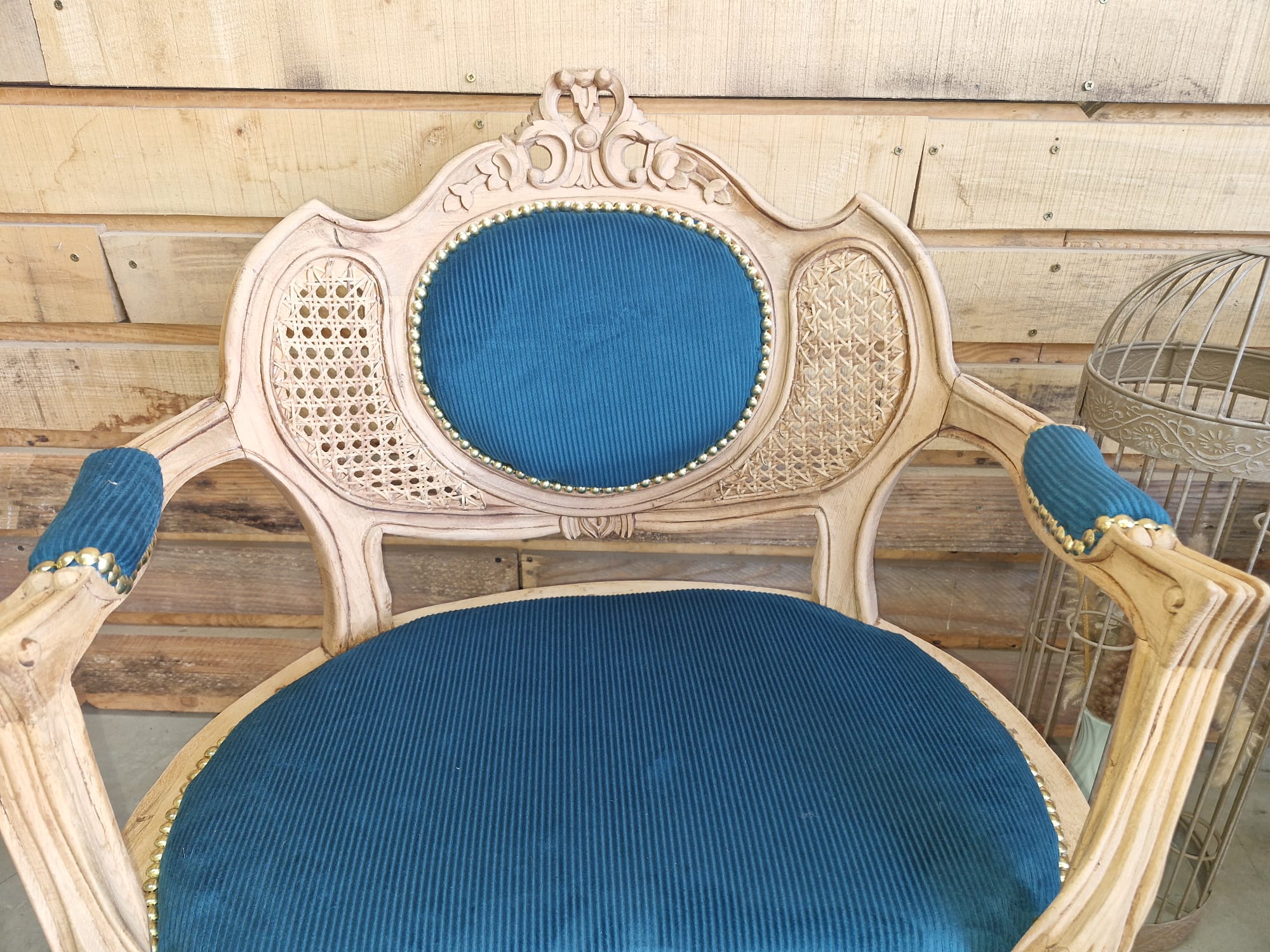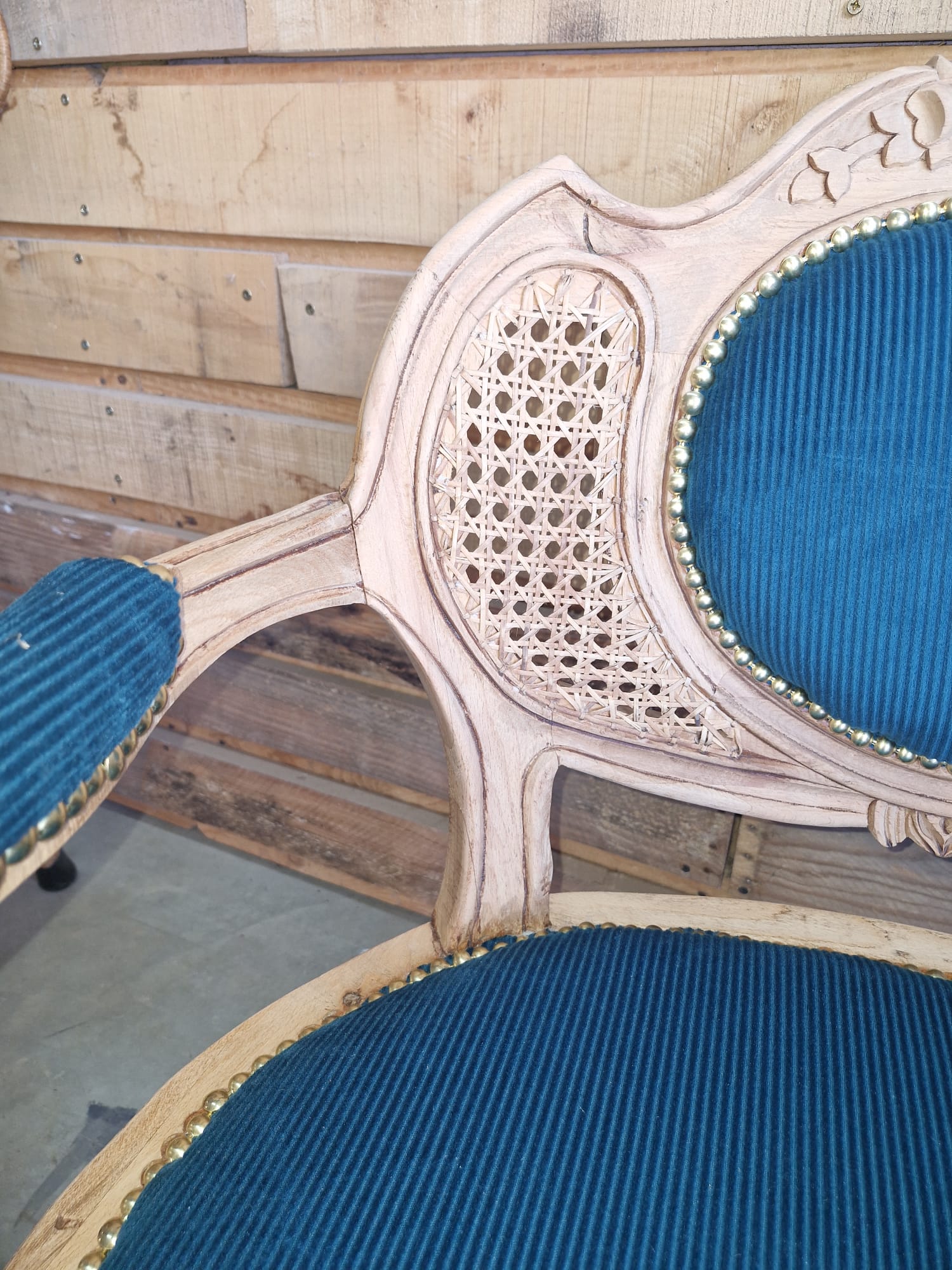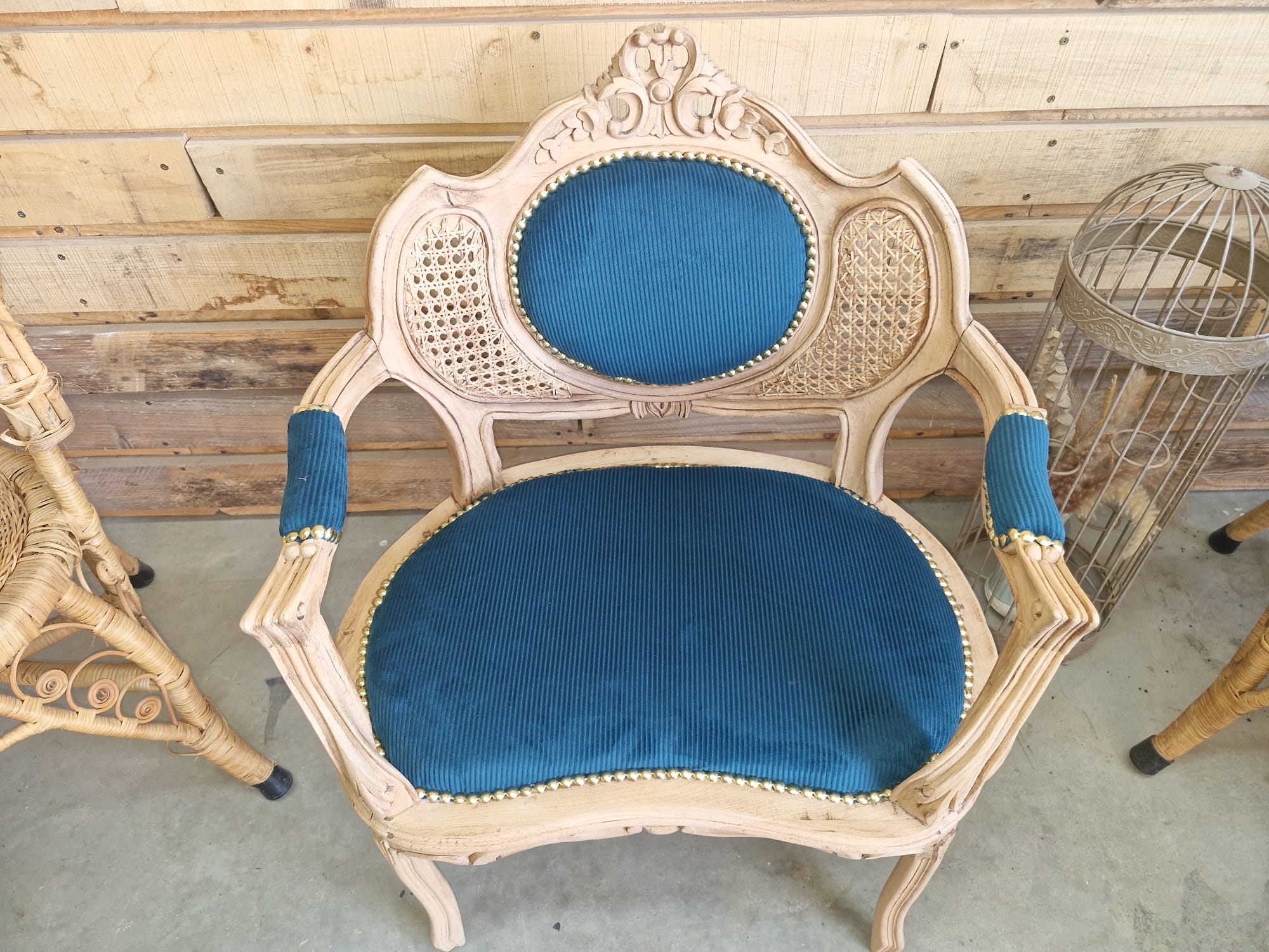 « Fauteuil Louis XVI cannelé Vends fauteuil Louis XVI cannelé en bois sculpté, recouvert d’un tissu bleu canard . Ce fauteuil est un véritable exemple de l’élégance et du raffinement du style Louis XVI. Caractéristiques : Bois sculpté d Tissu bleu canard en excellent état Structure solide et stable Style classique et élégant Dimensions : Hauteur 87 Largeur 69 Profondeur 48 État : Excellent état, restauré avec soin Un fauteuil unique pour ajouter une touche de sophistication à votre intérieur !